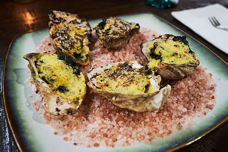 - Preheat oven to high broil. Lay about 1 heaping tablespoon spinach mixture on the bottom oyster shell. Then lay 1 oyster one top of each. Continue with Hollandaise.